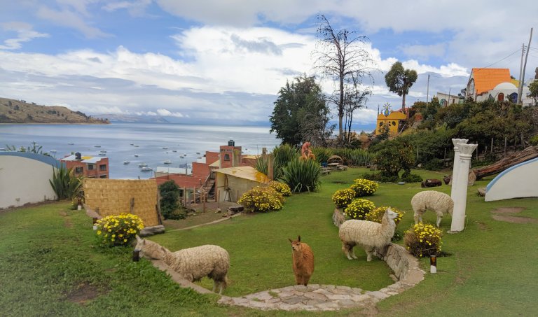 If you’re using Bolivia / Peru Hop to travel to Copacabana you’ll be dropped off at the White Anchor – a literal giant white anchor monument beside the lake. From there it’s a 15 minute uphill walk to reach La Cupula, but once you arrive the views are well worth the effort. We stayed in a standard double room which had a double and single bed, ensuite bathroom, a heater (for the chilly nights) and intermittent WiFi access. The hotel also has a common room, and a garden with hammocks that overlooks the bay. Plus – they have 4 friendly pet alpacas that you can feed with snacks available from reception. It’s a little more expensive than our usual stay – at £25 a night, but it was a nice treat.