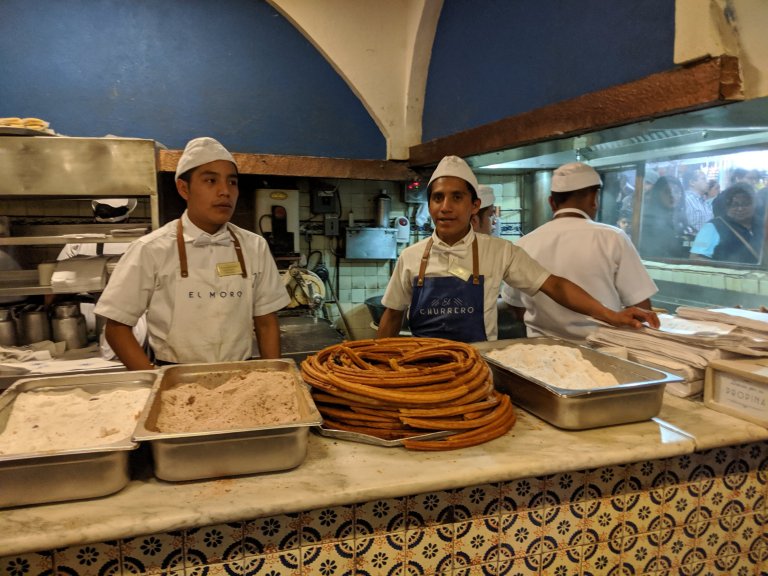 Okay food might be a bit of an overstatement for this place as it really is primarily a churrerio. They do also sell el pastor sandwiches and tacos from the front of the café, but make sure you don’t accidentally stand in the churros queue if it’s a sandwich you’re after.We visited twice and on both times people were queuing out the door to visit Mexico City’s oldest (and reputably best) churro place. The churros are fried in huge loops and then cut to size before being dipped in cinnamon and sugar. You can also order a sauce to dip your churros in – try the caramel one, it was amazing.