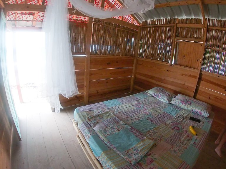 We chose a private cabin as it was not much more expensive than staying in a dorm room, and were expecting a sand floored basic hut. However, our cabin was actually raised with a wooden floor and had a little porch with a bench that overlooked the sea. There was a mosquito net but it wasn’t really designed for a double bed so we opted for bug spray instead. The toilets and showers were in a communal block about 10 metres away, and they were cleaned daily.